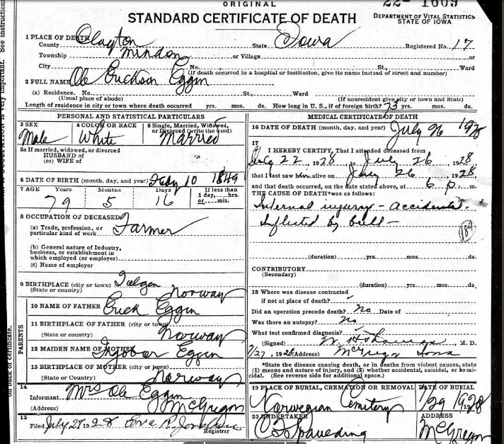 I found the death certificate for Ole. I believe that it says he died as a result of an accident with a bull!