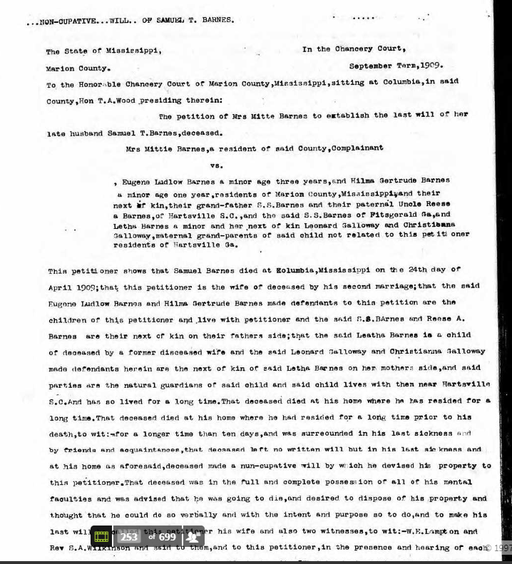 In a lawsuit filed after the death of Samuel Tilden Barnes, it states that Simeon Scarborough Barnes and Maggie were “next of kin”. Well, that means Samuel was related to them…but not necessarily their child. Right? The lawsuit is very tangled, but all of the right relative names are listed so … somehow, Samuel was “in the family” even though he is removed from many census forms and the math does not work for his birth date. He belongs with this family in some format, but could clearly NOT have been a biological son to Maggie. Oh dear!