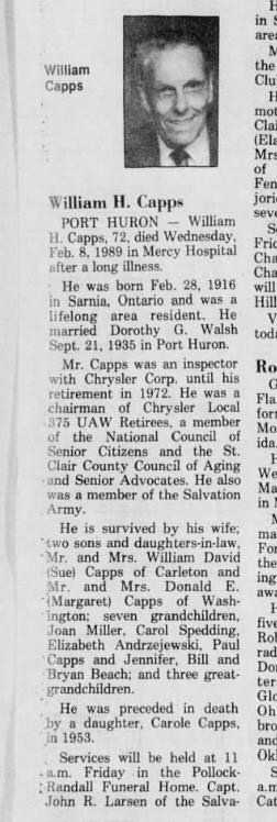 William H Capps was born on February 28, 1916, in Sarnia, Ontario, Canada, the son of Hazel Holbrook Capps and Percy Capps. He had two sons and one daughter with Dorothy G Walsh between 1936 and 1941. He died on February 8, 1989, in Port Huron, Michigan, at the age of 72, and was buried there.