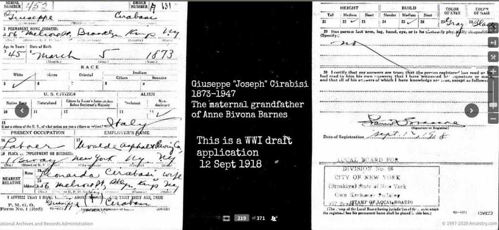 William seems to have 2 birth places! In some cases, he lists Argentina as his place of birth. BUT, in his petition for citizenship he states that he was born in Italy. The photo below is very interesting because it shows Pasquale Zinaupi as a witness who resides at the same 162 Irving Avenue address as shown in the photo I included for Frank and fits with Anne Bivona Barnes’ recollection of the owner of the building! The other witness is Giuseppe (or Joseph) his brother.