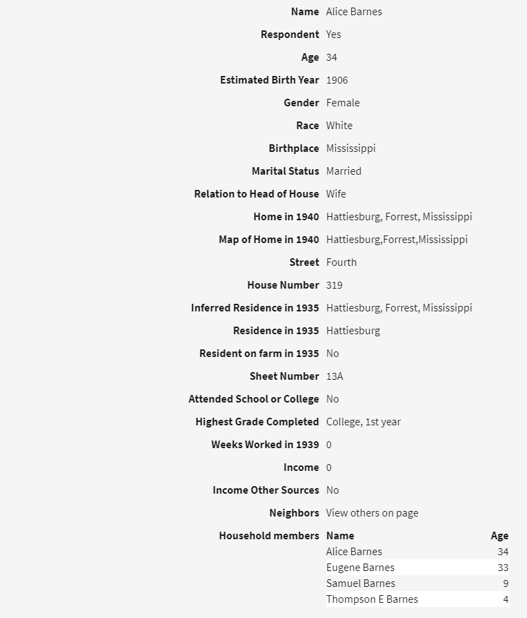 1940 US census shows Eugene is living in Hattiesburg, Mississippi with his wife and his sons Samuel and Thompson. He is a school teacher.