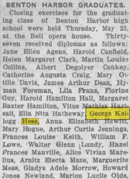 My paternal grandfather was George Kellogg Hess, Sr. He was born 6 Sept. 1891 in Benton Harbor, Berrien County, Michigan. He was born on a successful fruit farm whose harvests supplied the Chicago market and other large cities. He wanted to leave the farm! My father told me that George did NOT want to be a farmer. In the WWI draft application he completed on 5 June 1917, he states that he is employed by Western Electric Company, Hawthorne Station, Chicago. He went on to graduate from the University of Michigan in 1921 with a degree in Electrical Engineering. I have been told that he was a genius. He worked in Chicago for the electrical company until 1930. Perhaps you will recall the story my father told us so often. My father became direly ill in 1930 (he was 5 years old) and the doctors in Chicago said the only hope for my father’s survival was to move the family to the countryside and out of the large city. What? I know…huh? Anyway, this put George back at the orchard farm in Benton Harbor, MI. This was the same place he had so wanted to leave as a young man. My father’s story is even more amazing because at exactly the same time as my father became ill, George’s father Juan Hess died leaving the farm to George. George must have not liked going back to the farm enough that when his obituary was written it states that he “was a retired electrical engineer” without mention of his successful management of the farm. I have collected numerous newspaper articles that show that George was an activist, even to the point of traveling to Washington to lobby for certain changes that primarily related to pipelines, farm taxes and migrant workers.